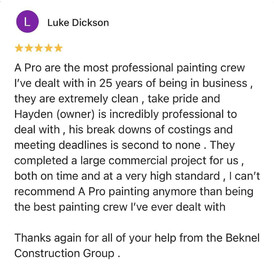 APro are the most professional painting crews I’ve dealt with in 25 years of being in business, they are extremely clean, take pride and Hayden (owner) is incredibly professional to deal with, his break downs of costings and meeting deadlines is second to none. They completed a large commercial project for us, both on time and at a very high standard, I can’t recommend APro painting anymore than being the best painting crew I’ve ever dealt with.