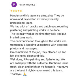 Hayden and his team are amazing. They go above and beyond an extremely friendly professional team. We had a lot of cracks and patch ups, requiring plastering and painting works to be done. The team arrived at the time they said and put in a full days work. The communication throughout the works was tremendous, keeping us updated with progress photos and messages. On completion of the job, they cleaned up and left the home clean and tidy. Well done, APro painting and plastering. We are so happy with the outcome. Our home looks fresh, clean and brighter it's fantastic! You guys are the best. I highly recommend this team.