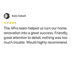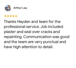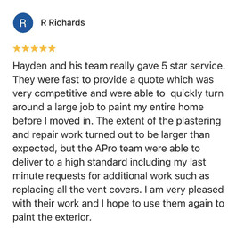Hayden and his team really gave 5 star service. They were fast to provide a quote which was very competitive and were able to quickly turn around a large job to paint my entire home before I moved in. The extent of the plastering and repair work turned out to be larger than expected, but the APro team were able to deliver to a high standard including my last minute requests for additional work such as replacing all the vent covers. I am very pleased with their work and I hope to use them again to paint the exterior.