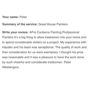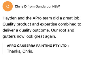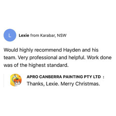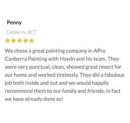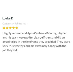We chose a great painting company in APro Canberra Painting with Hayden and his team. They were very punctual,clean,showed great respect for our home and worked tirelessly. They did a fabulous job both inside and out and we would happily recommend them to our family and friends;in fact we have already done so!
