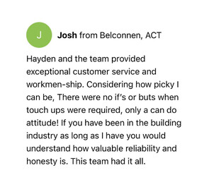It's a big thing to allow tradesmen into your home and to spend considerable dollars on a project. My experience with Hayden and his team was exceptional. The quality of work and their consideration for us were exemplary. I thought his price was reasonable and it was a pleasure to have the work done by such cheerful and considerate tradesmen. Peter Weetangera
