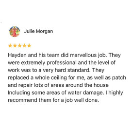 Hayden and his team did marvelous job. They were extremely professional and the level of work was to a very hard standard. They replaced a whole ceiling for me, as well as patch and repair lots of areas around the house Including some areas of water damage. I highly recommend them for a job well done.