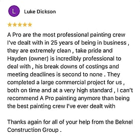 APro are the most professional painting crews I’ve dealt with in 25 years of being in business, they are extremely clean, take pride and Hayden (owner) is incredibly professional to deal with, his break downs of costings and meeting deadlines is second to none. They completed a large commercial project for us, both on time and at a very high standard, I can’t recommend APro painting anymore than being the best painting crew I’ve ever dealt with.