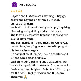 Hayden and his team are amazing. They go above and beyond an extremely friendly professional team. We had a lot of cracks and patch ups, requiring plastering and painting works to be done. The team arrived at the time they said and put in a full days work. The communication throughout the works was tremendous, keeping us updated with progress photos and messages. On completion of the job, they cleaned up and left the home clean and tidy. Well done, APro painting and plastering. We are so happy with the outcome. Our home looks fresh, clean and brighter it's fantastic! You guys are the best. I highly recommend this team.