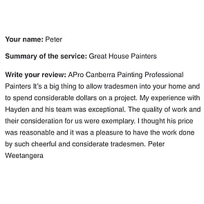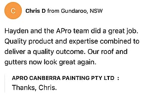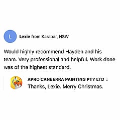 We chose a great painting company in APro Canberra Painting with Hayden and his team. They were very punctual,clean,showed great respect for our home and worked tirelessly. They did a fabulous job both inside and out and we would happily recommend them to our family and friends;in fact we have already done so!