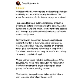 Hayden and his team really gave 5 star service. They were fast to provide a quote which was very competitive and were able to quickly turn around a large job to paint my entire home before I moved in. The extent of the plastering and repair work turned out to be larger than expected, but the APro team were able to deliver to a high standard including my last minute requests for additional work such as replacing all the vent covers. I am very pleased with their work and I hope to use them again to paint the exterior.