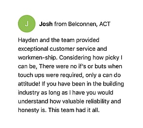 It's a big thing to allow tradesmen into your home and to spend considerable dollars on a project. My experience with Hayden and his team was exceptional. The quality of work and their consideration for us were exemplary. I thought his price was reasonable and it was a pleasure to have the work done by such cheerful and considerate tradesmen. Peter Weetangera