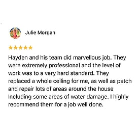 Hayden and his team did marvelous job. They were extremely professional and the level of work was to a very hard standard. They replaced a whole ceiling for me, as well as patch and repair lots of areas around the house Including some areas of water damage. I highly recommend them for a job well done.